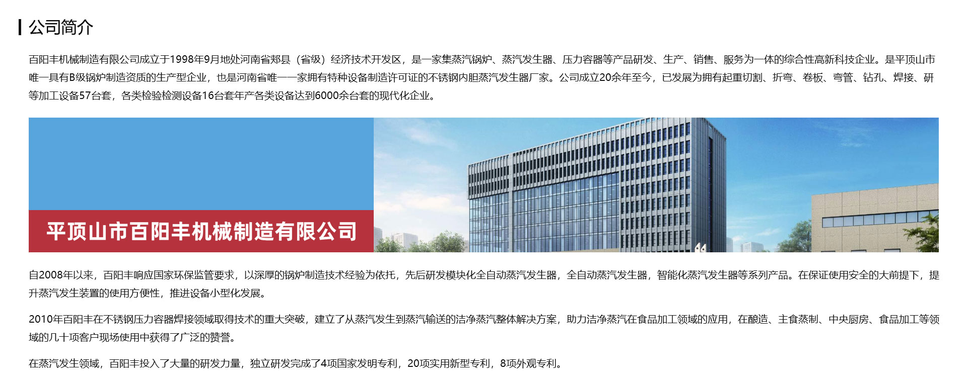 百陽(yáng)豐機(jī)械制造有限公司成立于1998年9月地處河南省郟縣(省級(jí))經(jīng)濟(jì)技術(shù)開(kāi)發(fā)區(qū),是一家集蒸汽鍋爐、蒸汽發(fā)生器、壓力容器等產(chǎn)品研發(fā)、生產(chǎn)、銷售、服務(wù)為一體的綜合性高新科技企業(yè)。是平頂山市一家具有B級(jí)鍋爐制造資質(zhì)的生產(chǎn)型企業(yè),也是一家擁有特種設(shè)備制造許可證的不銹鋼內(nèi)膽蒸汽發(fā)生器廠家。公司成立20余年至今,已發(fā)展為擁有起重切割、折彎、卷板、彎管、鉆孔、焊接、研等加工設(shè)備57臺(tái)套,各類檢驗(yàn)檢測(cè)設(shè)備16臺(tái)套年產(chǎn)各類設(shè)備達(dá)到6000余臺(tái)套的現(xiàn)代化企業(yè)。